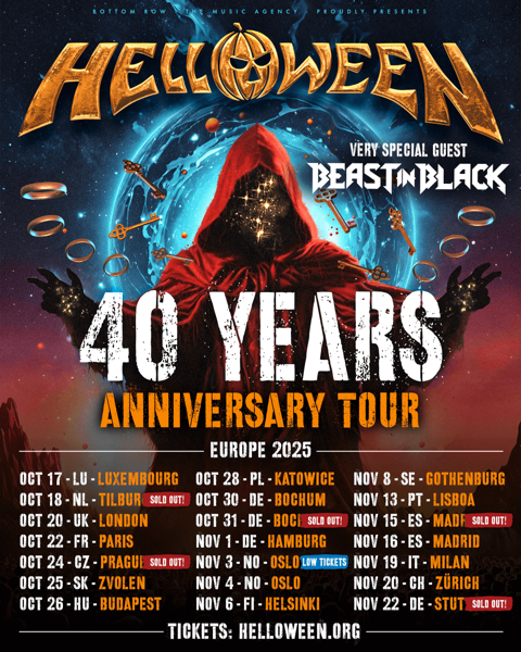 HELLOWEEN will celebrate four decades of metal mastery with a global 40th anniversary tour. The European leg begins in mid-October, with initial dates selling out quickly and additional shows in Madrid and Bochum already on sale. Featuring an ultimate set list packed with surprises, the tour will showcase the band’s unparalleled legacy and ongoing creative power.